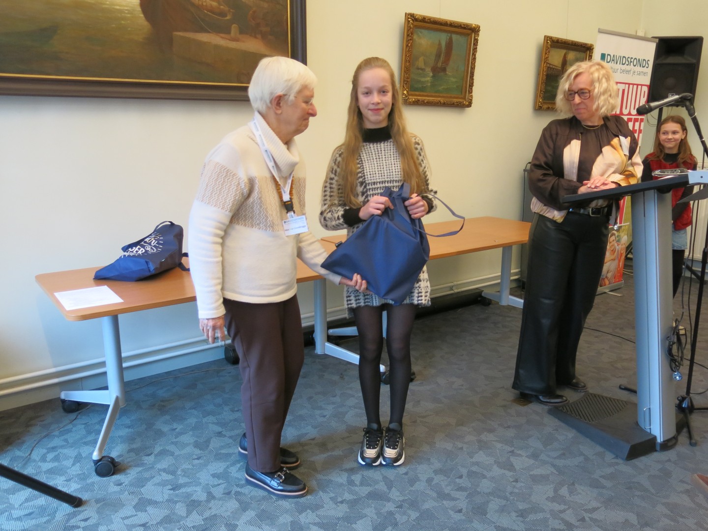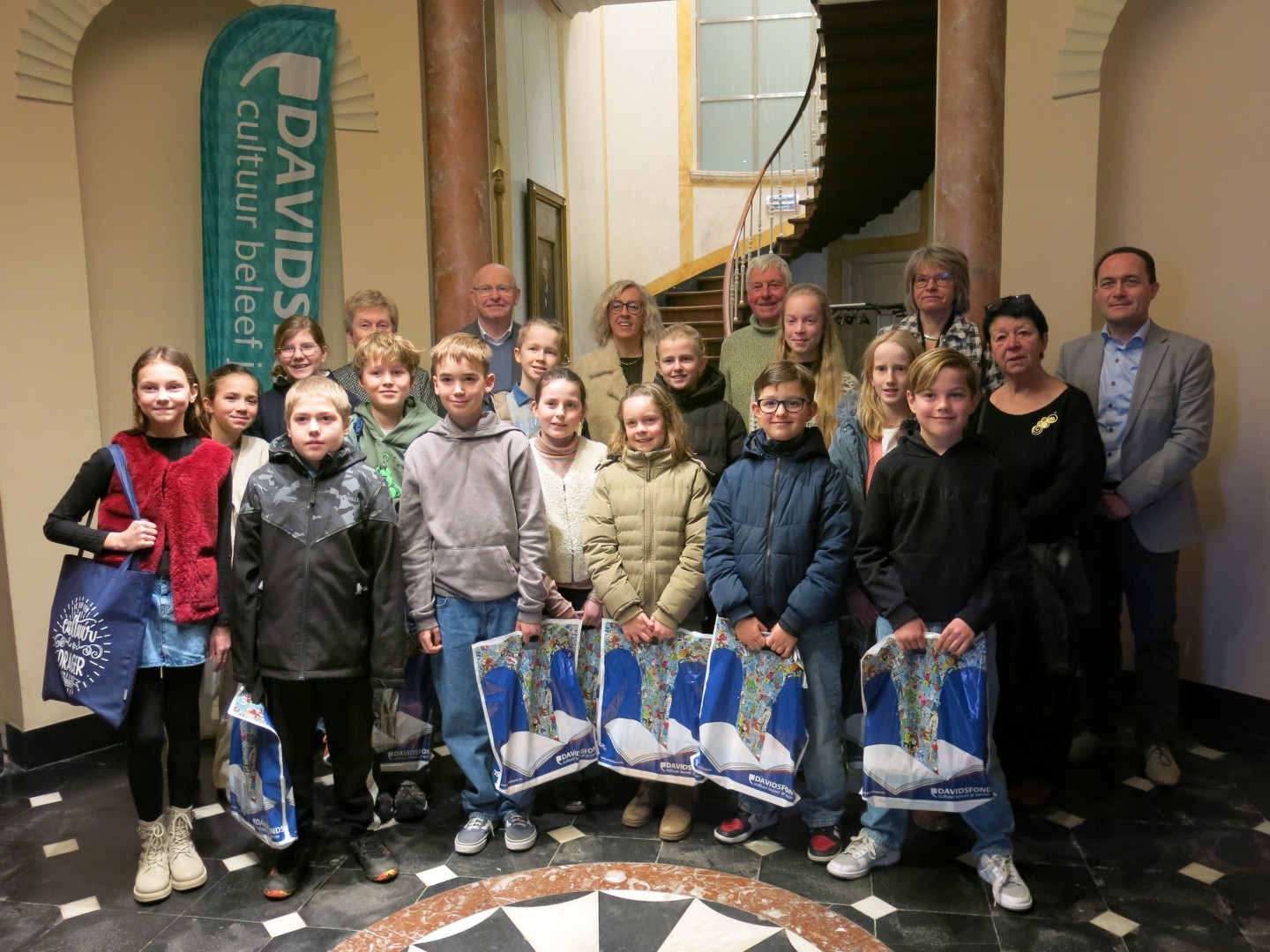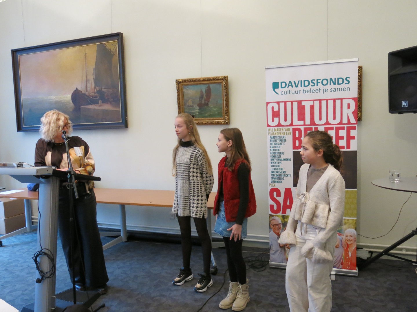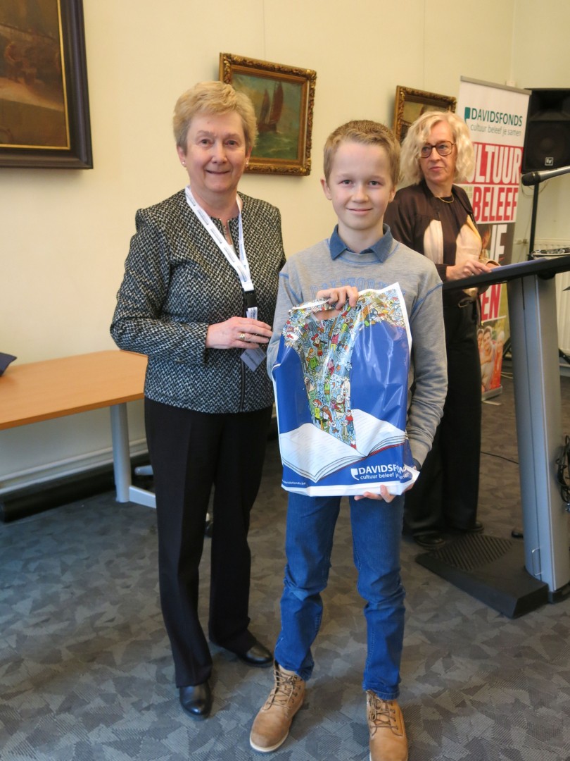 De winnaars JJ in reeks 1. Margot Debaene: vooraan rechts. Kris Opdedrynck, algemeen directeur Davidsfonds vzw: achteraan.